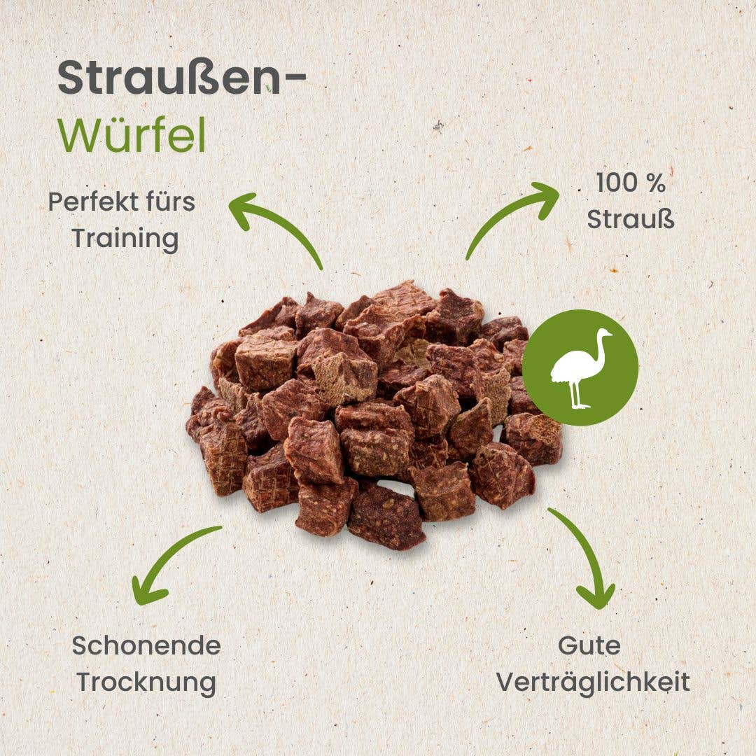 Friandises naturelles élaborées à 100 % à partir d’autruche, pressées en petits cubes ou découpées directement dans la viande, puis légèrement séchées.